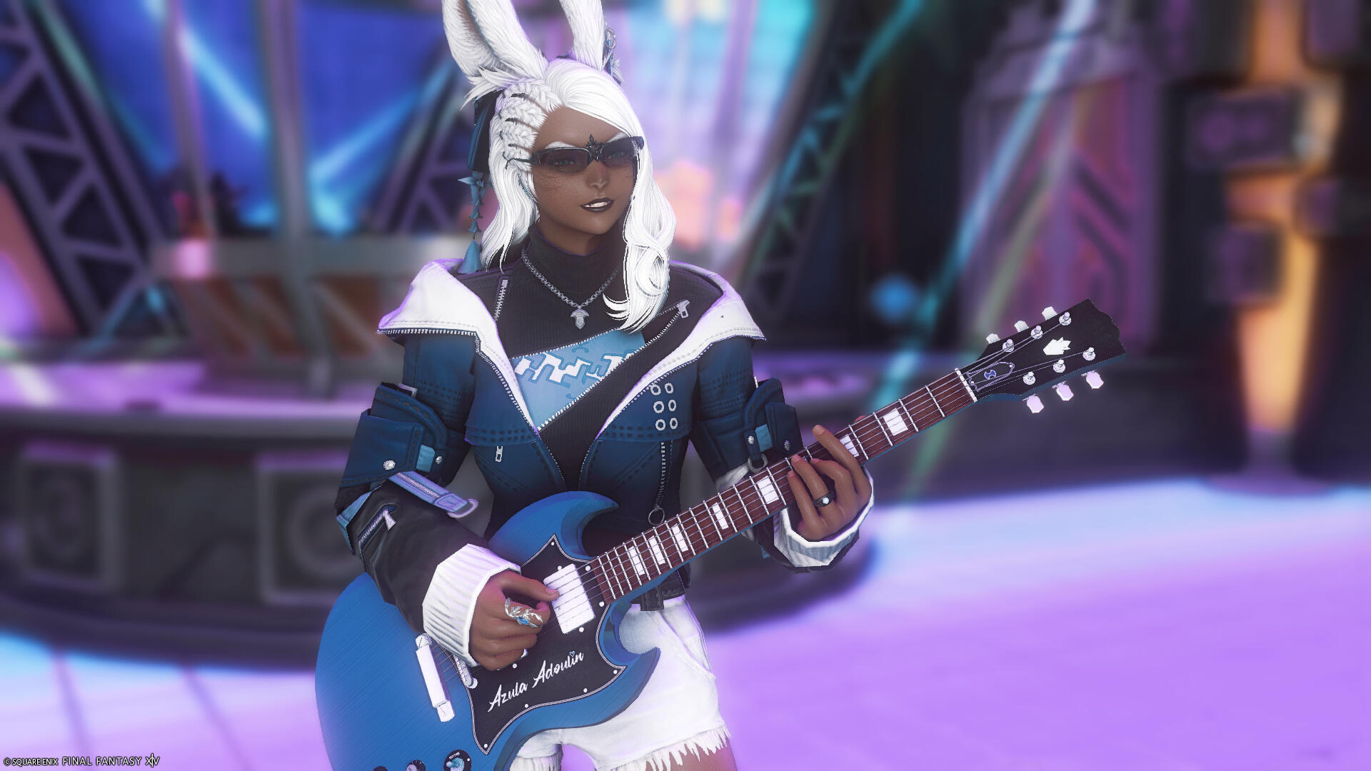 Playing the Guitar: Shortly after her arrival in Eorzea, she came across a small band performing in the streets of Limsa Lominsa. She was immediately drawn to the electric guitar and fell in love with it's unique sound. Her closest friends pitched in and had an electric blue one custom made for her.